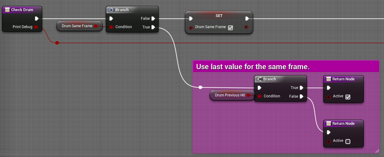 There is a bit of extra logic for the drum based on other assumptions that is not showcased here. However, to make sure all elements that check if the drum is active that frame, I make sure to just use the same value for all calls in the same frame.