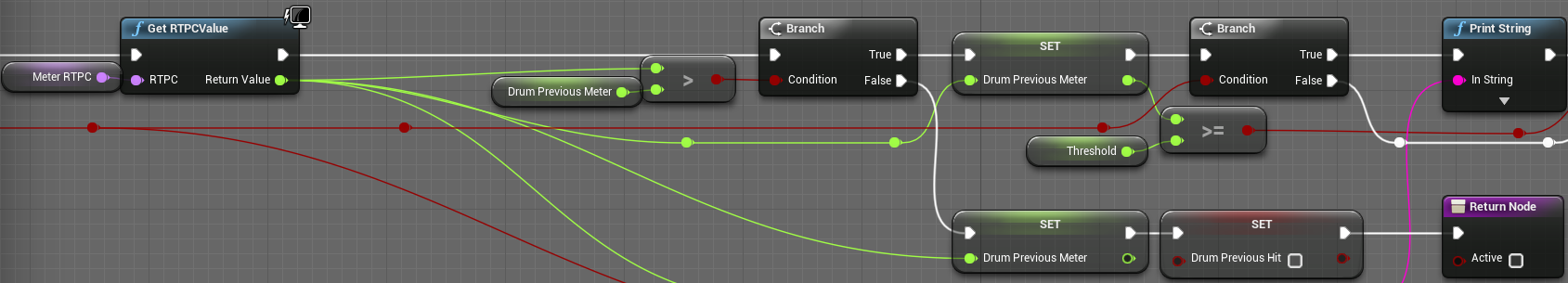 This is a portion of the function that checks for when the Drum is active and what counts as a hit. Since I have a separate algorithm per instrument, it allows me to assume certain things about the nature of the data. Metering in Wwise only get's me amplitudes, which I take via RMS. For drums, since I know it is percussive, I can assume there will never be back to back hits, and that a hit will occur as values quickly increase which will then quickly decrease. I can then make sure the ramp-up is above a certain threshold so it won't trigger so early, or get false positives.