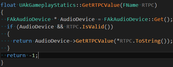 The code is pretty straight forward, as I just had to define the functions correctly for them to be used in Blueprints. This shows 2 of the 3 files I had to edit (AkAudioDevice, AkGameplayStats, AkComponent) for the functionality to work as intended. For GetRTPC in particular, I also needed to add the Wwise Query headers in order to have access to those functions.