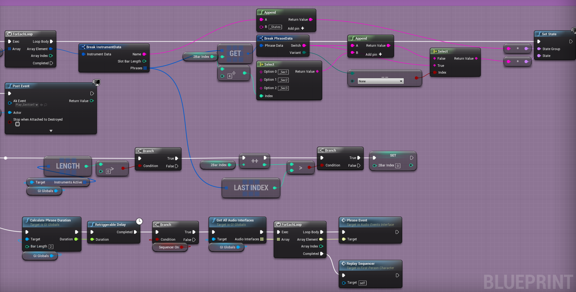 The above snippet is the sequencer at it's core. Every 2 bars in time it sets the appropriate states in Wwise based on the next segment of phrases. The states names are created on the spot, comprised of data of the instrument, phrase variant, and current section of the Orchestrator. After the states are set, it posts the corresponding Wwise event, prepares for the next step in the Orchestrator, sends out a Phrase event, and then repeats until stopped.