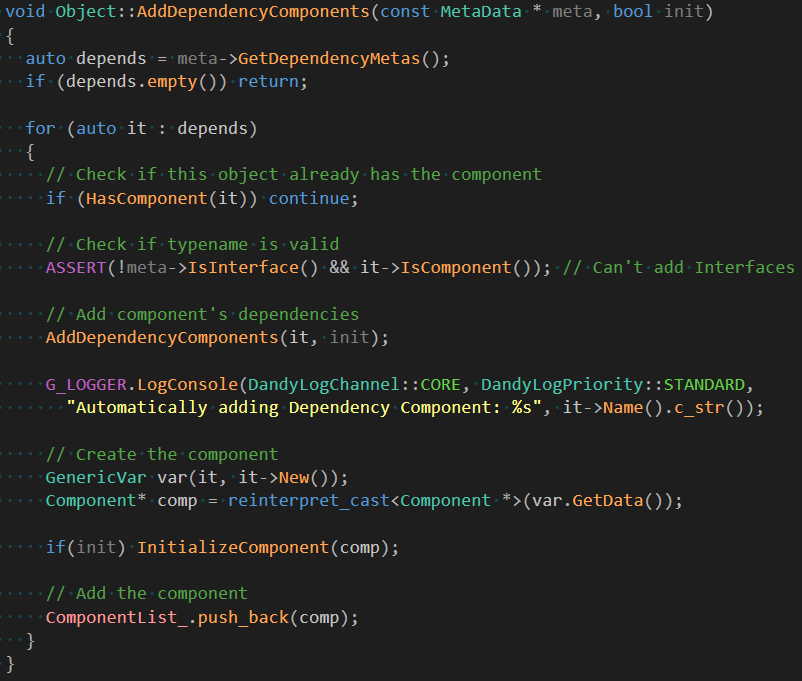 In addition, it is very easy to go ahead an add a component without first adding its dependencies. Since this was so common to forget, I decided to make everyone's life easier and automatically add all components it depended on. If some of the components it depended on were added, in this case it wouldn't warn the user and just skip that component, since this was more of a behind-the-scenes feature. It would however, log that it was automatically adding the components so the user was aware of what was added.