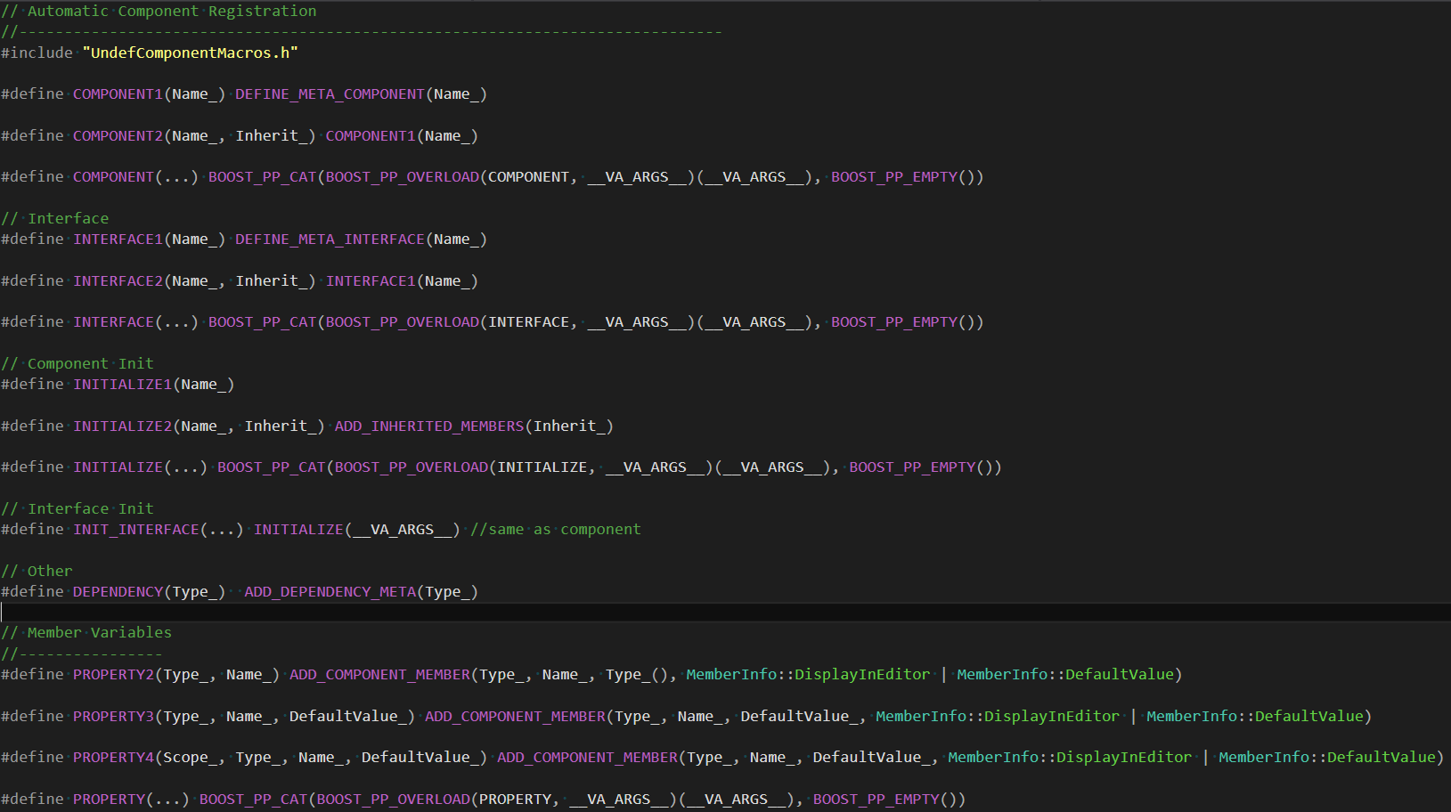 The approach I took with enums were similar to the custom components, and that was wrapping all of the functionality into macros that my team would use. You can see here a simple creation of the enum used for the window mode. The reason implementing enums was a project of its own, is because each enum is a different type.