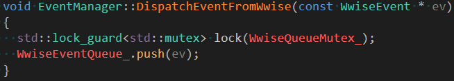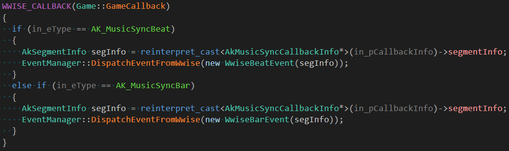 Below is an example of the Wwise music callbacks passing information to the event manager. Since the callback is called on the audio thread, I had to make sure I did as little processing to to not hold up the thread. It just takes the information it needs, adds it to a thread-safe queue, and waits to flush the events later in the normal game-loop on the main thread.