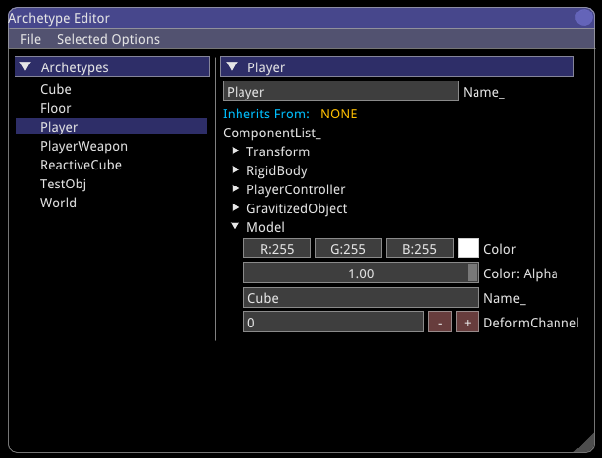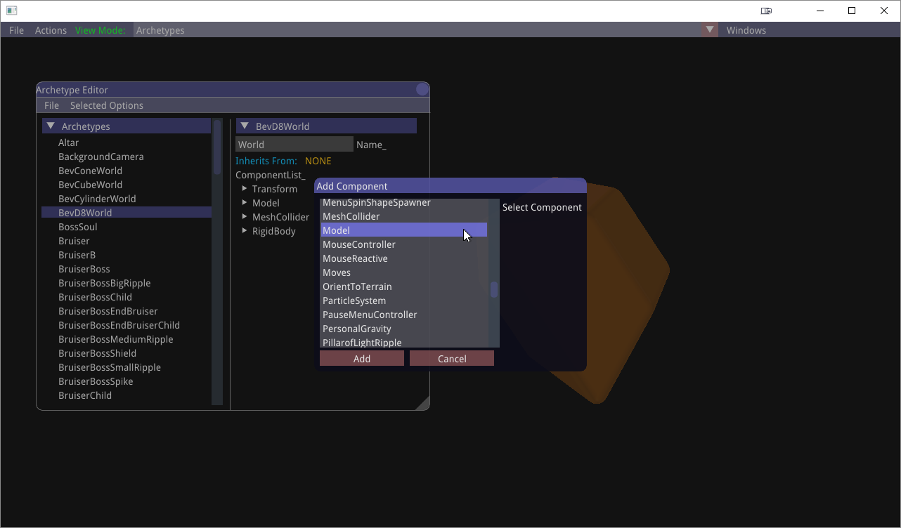 I focused on the Archetype Editor and made sure to implement features such as: New / Delete Archetypes, Add / Remove Components on Archetypes, as well as be able to edit the specified properties on each Component. Once I got the main functionality in, I decided it would be worth adding a model viewer, to allow users to see some of the changes they are making at runtime.