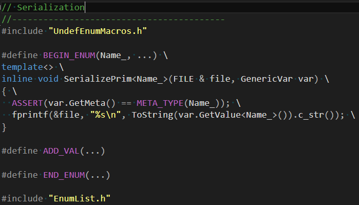 I really didn't want to manually create specialized serialization functions for each enum someone created, so I made a way for them to be automatically created.