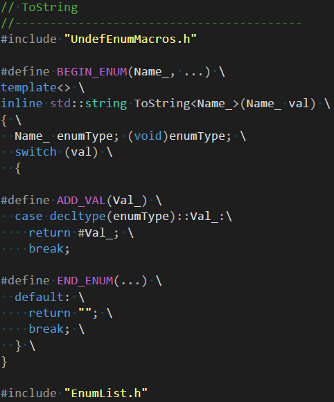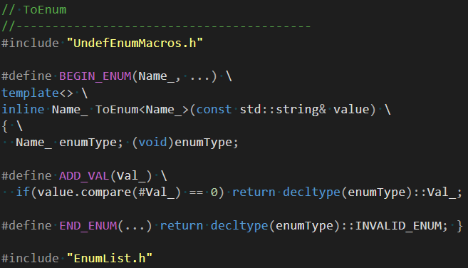 In order for to serialize the enums, I needed a way to go to and from the string / enum representation. ToEnum takes a string as the value name and and returns the corresponding enum. To avoid requiring the enum type in the ADD_VAL macro, I just declared the enum at the start of the function which allowed me to get the type via decltype in the following macros. I similarly created a ToString function, which was also needed for serialization.