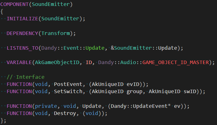 With the help of Wwise, I was able to make the SoundEmitter component very small and simple. All it needed to do was handle updating Wwise with information about the object automatically without user prompt. It was nice to also build in the functionality to post events and set switches from this component as well, since it allowed the user to only need to pass the event, and the ID was taken care of. While it would be a small thing to manage, it makes posting Wwise events from objects much shorter and simpler.